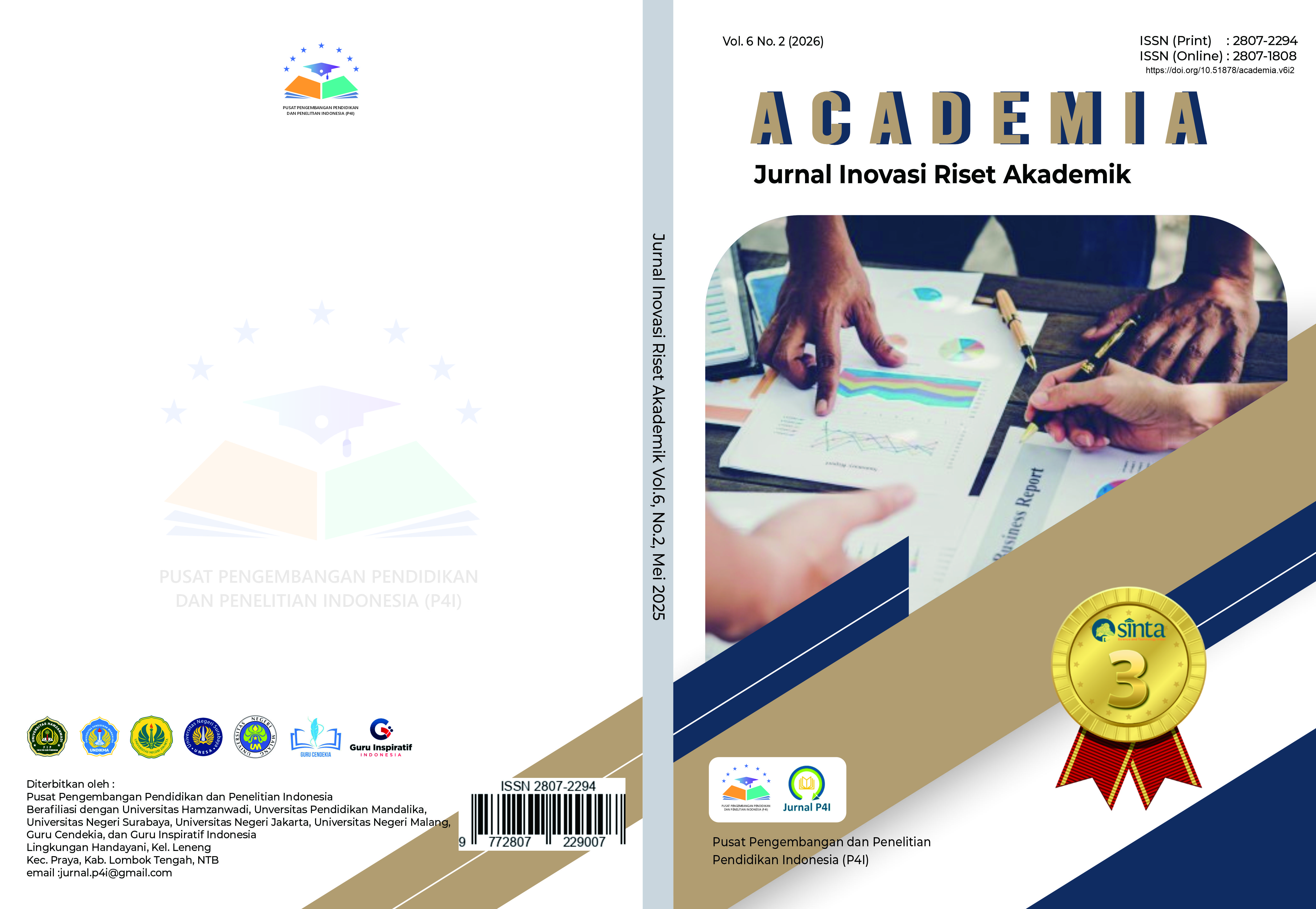 ACADEMIA: Jurnal Inovasi Riset Akademik |Terakreditasi Sinta 3 |diterbitkan 4 kali setahun (Februari, Mei, Agustus dan November) oleh Pusat Pengembangan Pendidikan dan Penelitian Indonesia (P4I) yang berafiliasi dengan Perguruan Tinggi Indonesia. Jurnal ini berisi artikel hasil pemikiran dan penelitian yang ditulis oleh para guru, dosen, pakar, ilmuwan, praktisi, dan pengkaji dalam inovasi riset akademik.